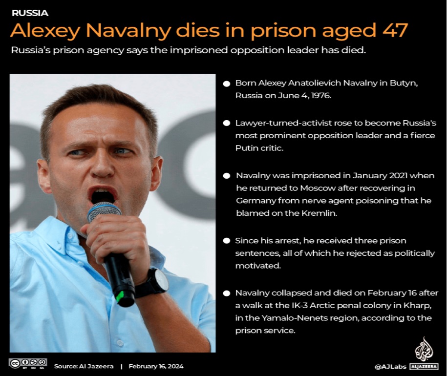 According to media, Navalny died in prison after collapsing during a walk. He was in the IK-3 colony in Kharp, a remote and harsh place north of the Arctic Circle, where he was moved in December.