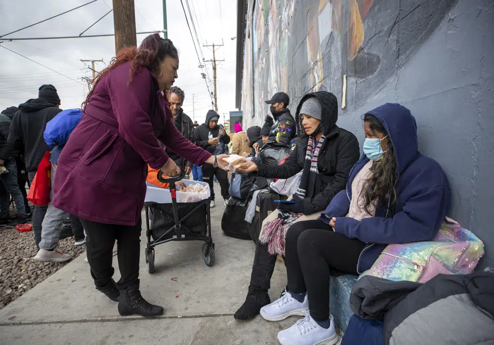 Despite the court stay Monday, the City of El Paso rushed to expand its ability to accommodate more migrants by converting large buildings into shelters, as the Red Cross brings in 10,000 cots. Local officials also say they hope to relieve pressure on local shelters by chartering buses to other large cities in Texas or nearby states, bringing migrants a step closer to relatives and sponsors in coordination with nonprofit groups. El Paso residents Roberto Lujan and Daniela Centeno handed out fruit, Hostess cakes, soda and chips to throngs at a street corner.