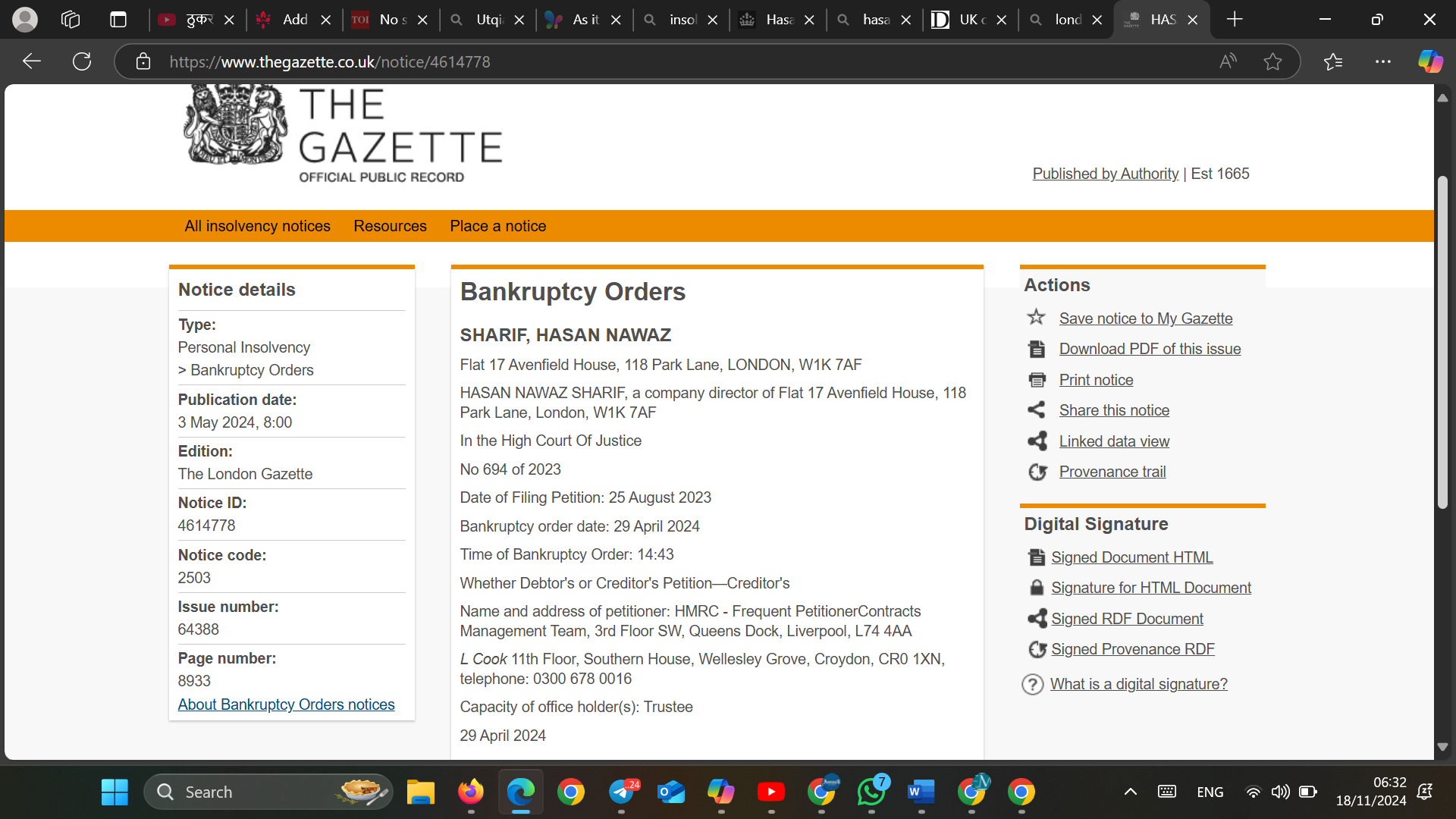 The bankruptcy details, which emerged on Sunday, were officially published in the UK Gazette, the public record for insolvency cases. According to the Gazette, Hasan Nawaz, residing at Flat 17, Avenfield House, 118 Park Lane, and serving as a company director, was declared bankrupt under case number 694 of 2023.