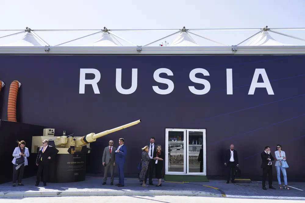 To reach the Russian exhibition tent, visitors to the exhibition had to exit Abu Dhabi’s cave-like National Exhibition Center and cross a skybridge to the outdoor area. Russian authorities initially stopped AP journalists from entering the tent while the event was taking place, without explanation. About an hour later, an AP journalist saw Denis Manturov, Russia’s Minister of Trade and Industry, emerge from the tent.